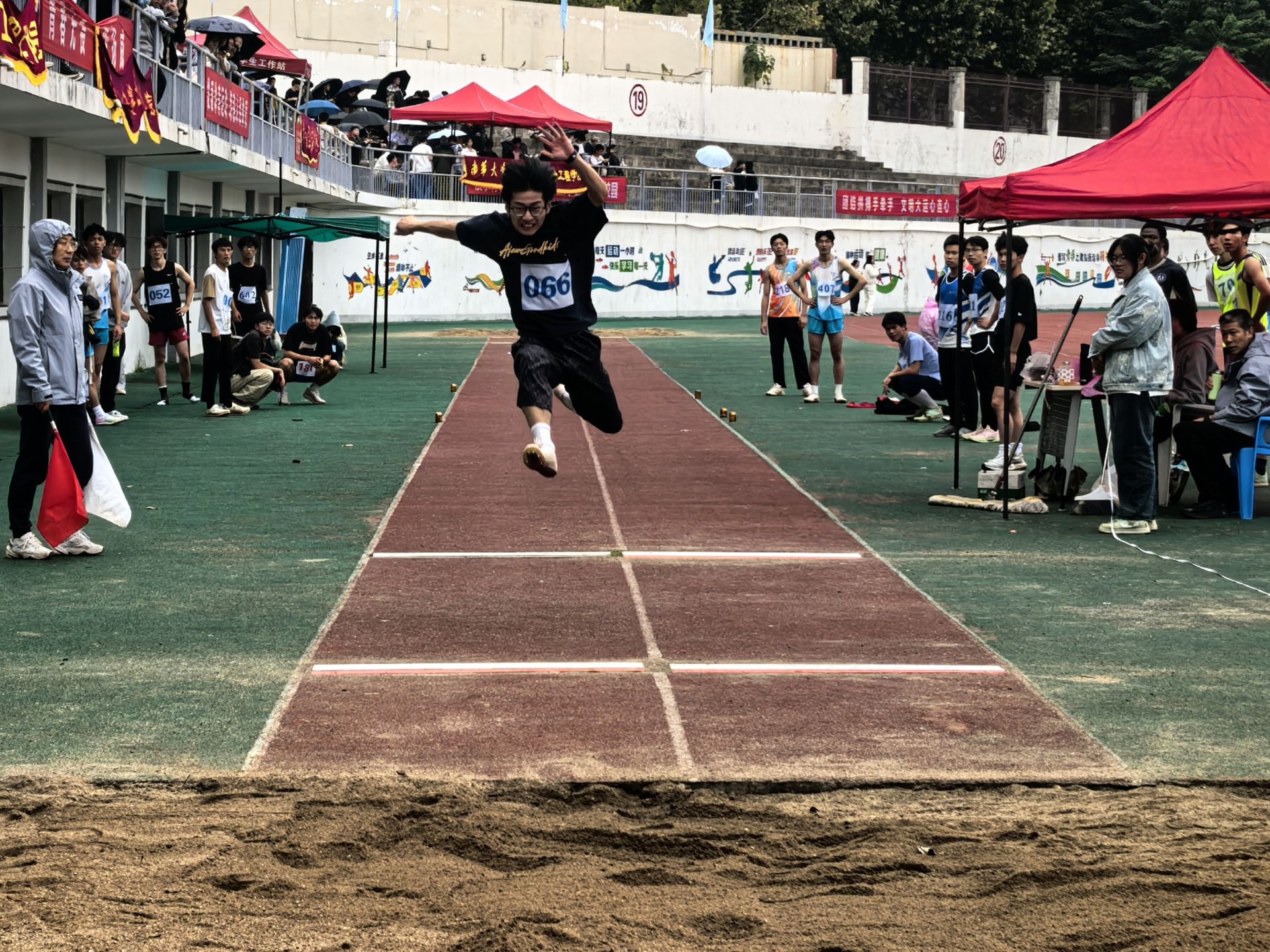 在激烈的三级跳远预决赛中,胡方志同学沉着冷静,助跑精准有力,起跳果断决绝,三次腾空如猎豹般矫健,最终以12.51米的优异成绩打破了保持2021年的校运会纪录12.47米,夺得该项目冠军。这一跃,不仅跃出了电气学子的风采,更跃出了追求卓越的精神高度。