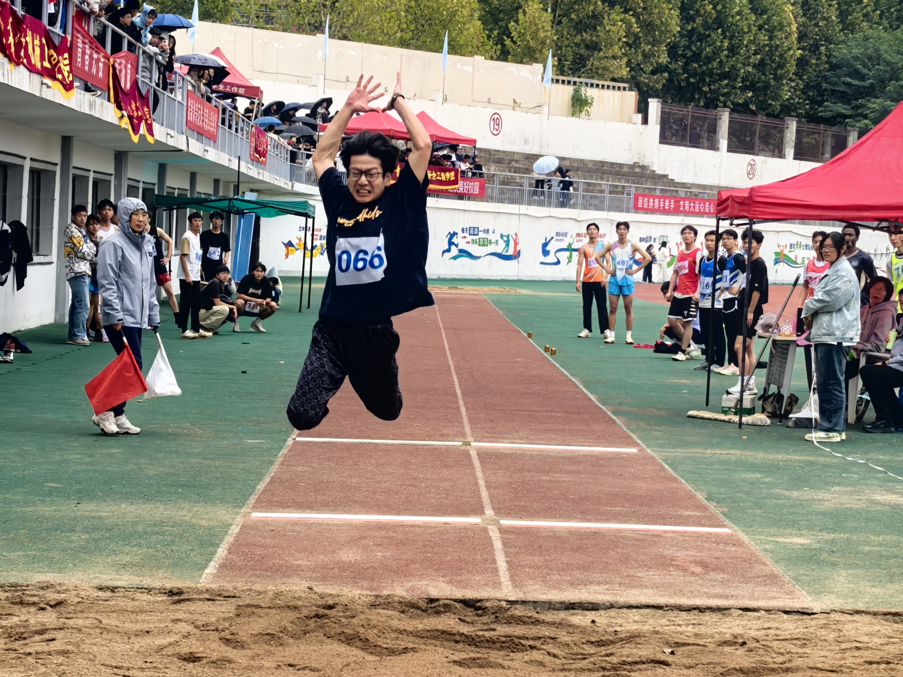 田赛男子组三级跳远预决赛,胡方志助跑、起跳、落地一气呵成,斩获第一名并打破校纪录,尽显电气学院风采。
