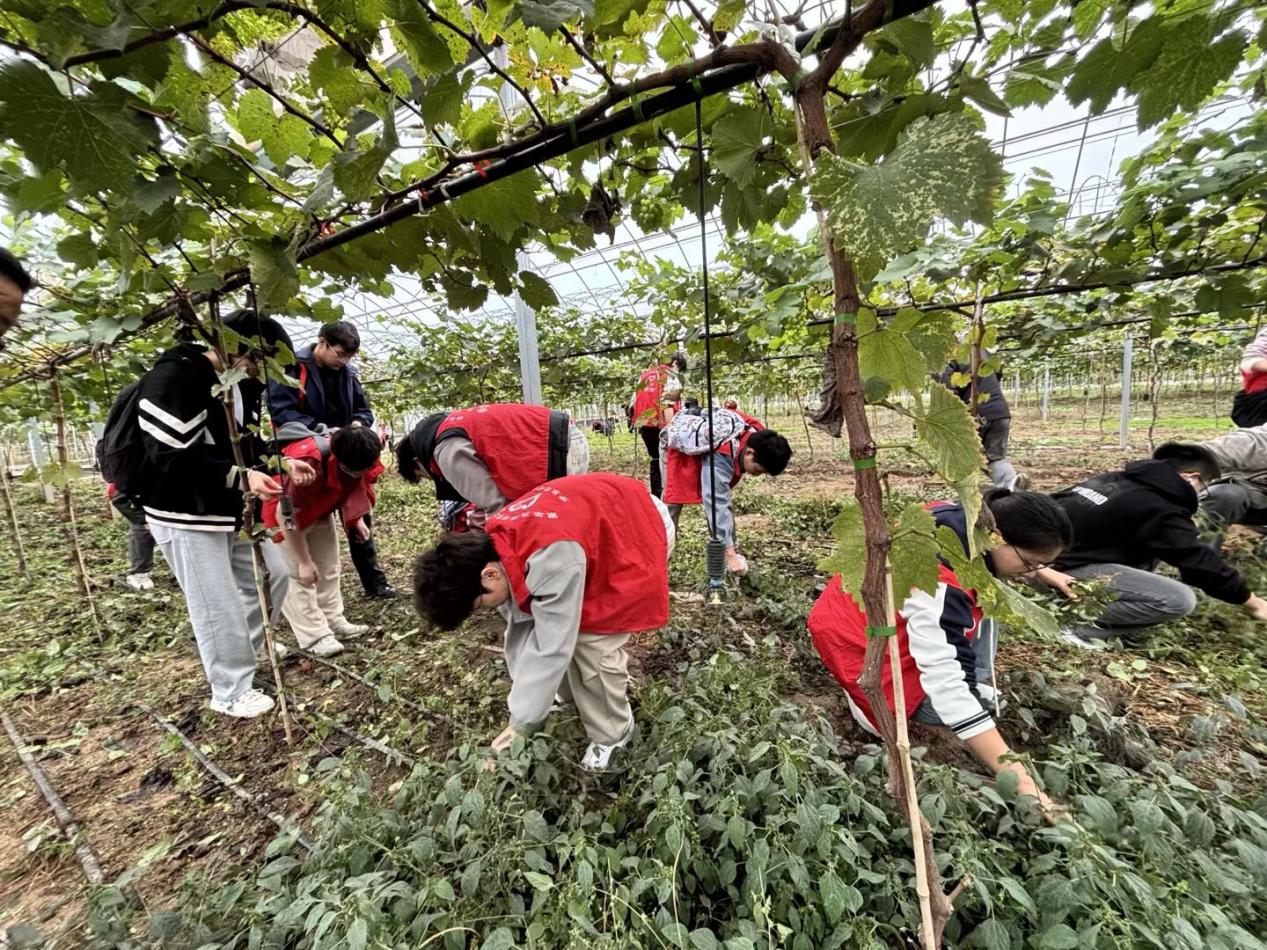 参观完毕,师生们来到了新桥村重点打造的清花湾聚晴葡萄基地,由当地农民专家讲解农业精细化管理以及所取得的显著效果,并演示了修剪、滴灌、施肥等工作过程,通过一系列有别于传统农业的管理措施,达到了“节能、环保、精确、丰产”的奋斗目标,其间还对同学们感兴趣或不明白的地方进行解答,使大家对于现代农业生产流程有了更加明确的认知。纸上得来终觉浅,绝知此事要躬行,最后全体师生扑下身子、放下架子、甩开膀子为葡萄园除草。虽然秋风萧瑟,但不过几分钟大家就隐隐有细汗渗出。很多自小在城里长大的同学,在这里经历了第一次拔草,第一次泥巴沾满双手,第一次腰酸背痛;但大家热情依然高涨,没有一位同学退缩,大家相互协助教授方法,在经历了刚开始的茫然无措后,一切都变得井然有序起来,劳动效率也大幅提高,并且有了很多新的发现:过季的葡萄虽然颜色变成紫色但味道确实酸涩的;超市里十几块一斤的野菜,这里被当做杂草直接扔掉的;听旁边的同学说这种草的汁液能够治疗刀伤;蚯蚓蜈蚣各类昆虫不时在草丛间出没等,每一次新的发现都会带来一点点小惊喜,劳动的过程也成为探索发现的旅程,欢声笑语始终萦绕在葡萄架下,并随着秋风飘向远方。不到两个小时的劳动让所有参与者感到收获满满,同学们纷纷表示:以前听闻“一粥一饭,当思来之不易;半丝半缕,恒念物力维艰”只觉词句幽美,但只有亲自参与劳动、近距离接触劳动者,才能更加真切地体会劳动的艰辛与意义。
