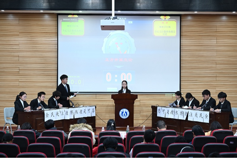 冠亚赛中,正方通信2503班与反方通信2504班聚焦“全民关注微博热搜是可喜/可悲”这一辩题展开辩论。正方强调信息普惠促进民生监督、热搜凝聚社会价值,论述全民关注是信息时代的积极产物;反方则主张平台泛娱乐化消解公共理性、热搜消费深度思考,强调过度关注背后的负面效应。双方从社会价值、信息生态两个维度展开辩论,对全民关注热搜的时代现象进行了深刻剖析。