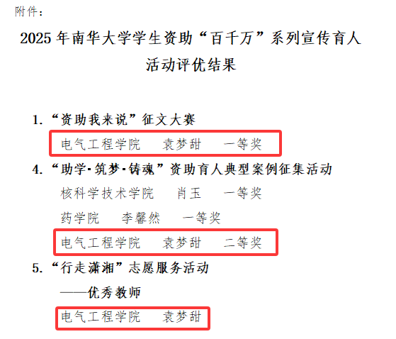我们教师袁梦甜在此次活动中表现突出:荣获“资助我来说”征文大赛一等奖、“助学・筑梦・铸魂”资助育人典型案例二等奖,并在“行走潇湘”志愿服务中被评为“优秀教师”,集中体现了我们教师在立德树人、实践育人方面的示范引领作用。